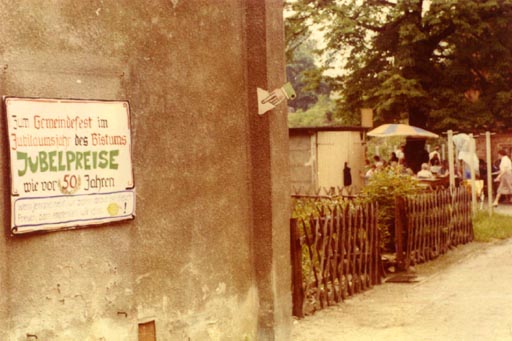 12.10.1980 – Aus der Vermeldung: In dieser Festwoche anlässlich des 50.Bistums-Jubiläums sind die verschiedensten Veranstaltungen in Berlin. Genaueres bitten wir dem St. Hedwigsblatt und dem Programmblatt zu entnehmen. Hier wie in allen Kirchen des Bistums wird am nächsten Sonntag um 10 Uhr ein festliches Hochamt sein, zu dem wir die ganze Gemeinde einladen! Die Jugend fährt über Sonnabend/Sonntag nach Berlin, die Mitarbeiter am Dienstag, die Priester am Mittwoch, die Gemeindevertreter am Sonnabend.