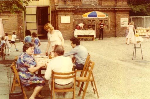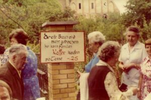 8.6.1980 – Die Fronleichnamsfeier mit Prozession im Garten des Marienkrankenhauses bei gutem Wetter. Nachmittags um 15 Uhr wird auf dem Hof vor der Pfarrkirche unter der Linde wieder die alte Tradition eines Gemeindefestes aufgenommen. Kaplan Richter hat ansprechende Plakate gemalt. „Im Jubiläumsjahr Preise wie vor 50 Jahren“, was dann auch an den einzelnen Ständen durchgehalten wird: Kaffee, Kuchen, Bier, sonstige Getränke, Waffeln, Grillwürste … Kinderspiele u.ä. – Bildergalerie zum Gemeindefest 1980:
